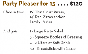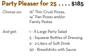 Cater your celebration with Monical’s Pizza, complete with delicious food and all of the accessories including: plates, napkins, flatware, cups, serving tongs and squeeze bottles of dressing. Delivery is included when and where available.